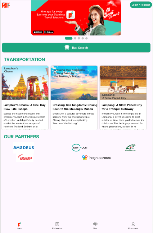 Tayland genelinde bilet ve seyahat fırsatları için başvuracağınız uygulama olan FAIRFAIR ile kusursuz seyahatin tadını çıkarın. Otobüs taşımacılığında uzmanlaşan firmamız, ülke çapında otobüs biletleri ve paket turlar sunmaktadır. Çok sayıda otobüs ve havayolu ortağıyla birlikte, gelişmiş filtreleme sistemimiz fiyatları karşılaştırmanıza ve en iyi fırsatları bulmanıza yardımcı olur. FAIRFAIR ile seyahat planlamanızı zahmetsiz ve kolay hale getirin. Hemen indirin ve yolculuğunuza kolayca başlayın!