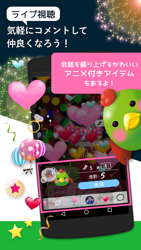 あなたのライフスタイルや才能を高画質な全画面でライブ配信することはもちろん、他のユーザーがライブ配信しているコンテンツも高画質な全画面で視聴することができます!さらリアルタイムにコメントやプレゼントを贈ることで配信者も視聴者も大盛り上がり!