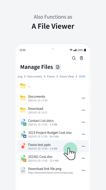 Fasoo View Uygulaması, kullanıcıların belgeleri güvenli bir şekilde indirmesine ve erişmesine olanak tanır. Kullanıcıların Android tabanlı telefon ve tabletlerde güvenli bir şekilde iletişim kurmasına, bilgi paylaşmasına ve hem normal hem de şifreli belgeleri görüntülemesine olanak tanır.