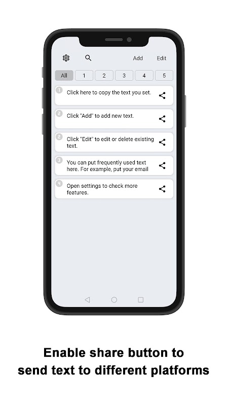 Metni uygulamaya ekleyebilir ve her ihtiyacınız olduğunda tekrar tekrar yazmadan panoya kopyalayabilirsiniz. Ayrıca, her zaman metin ekleyebilir/düzenleyebilir ve belirli etiketlerle ayarlayabilirsiniz.