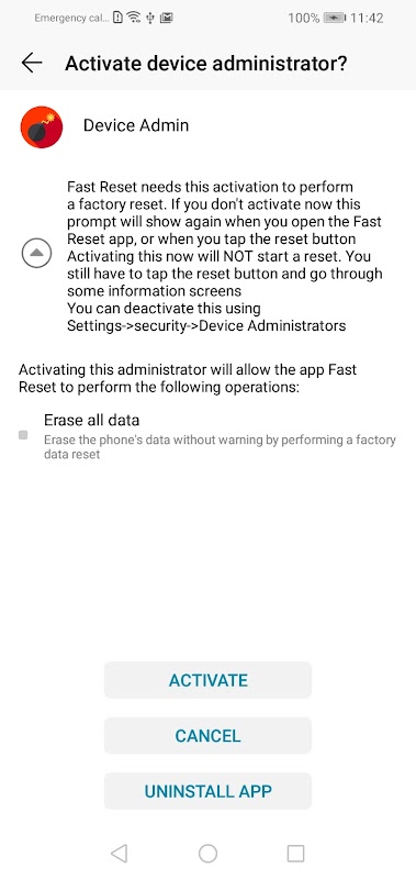 Hızlı Fabrika Ayarlarının çalışması için cihaz yöneticisi olarak etkinleştirilmelidir. Fabrika ayarlarına sıfırlama işlemini gerçekleştirmek için bu gereklidir.