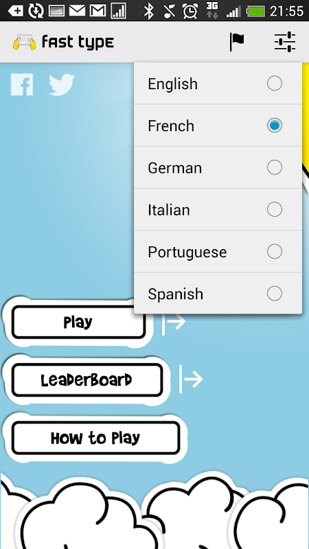 The application will let you choose the languages you want for improvement : English, French, German, Spanish, Portuguese, Italian: select your language and type the words!