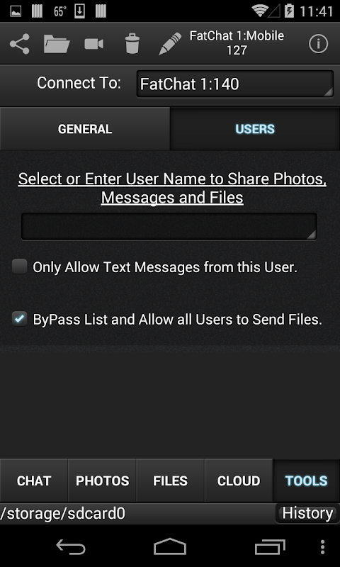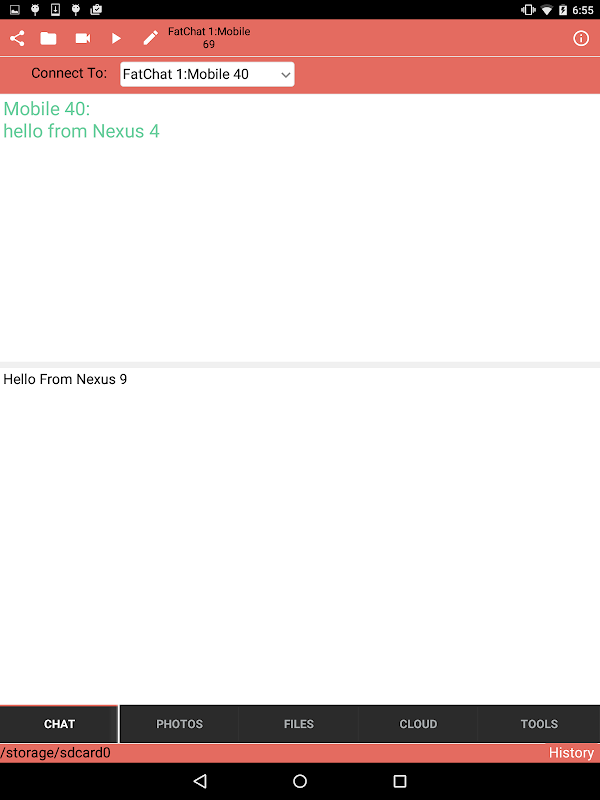 Android için Fat Chat WiFi bağlantısı kullanarak Yerel Alan Ağı PC'ler ile iletişim kurmak için Fat Sohbet çalışan Android cihazları tanır. Çünkü programların gibi göndermek ve Yağ Sohbet çalışan cihazlar ve bilgisayarlar arasında Fotoğraflar, Metin ya da başka herhangi Dosyaları almak için yeteneği gibi ek özellikler, Fat Chat denir. Bir Kullanıcılar listesi kurmak ve gönderme fotoğraf ve dosyaları izin vermek veya engellemek kullanıcıları, ama yine de metin mesajları alabilirsiniz. A History günlük gönderilen dosyaların tutulur ve cihazınız ya da PC'niz üzerinde alınır. Hiçbir IP adresleri Fat Sohbet çalışan tüm cihazların otomatik olarak ağ aygıtı algılama ile endişelenecek. Android cihazınızda fotoğraf çekin ve bilgisayarınıza doğrudan gönderebilirsiniz. Seçin ve mp3 ve mp4 dosyaları da dahil olmak üzere pek çok dosya türlerini gönderin. Erişim Cloud Depolama hesapları: Google Drive, Box, Drop Box ve Sürücü biri.