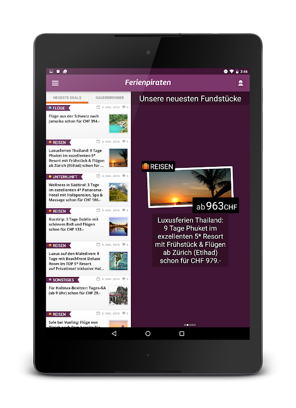 Du brauchst Ferien? Suchst du nach günstigen Flügen, Pauschalreisen, Hotels oder Gutscheinen? Dann bist du hier richtig! Du bekommst die besten Schnäppchen der Ferienpiraten direkt auf dein Smartphone und sparst jede Menge Geld bei deinem nächsten Urlaub! In der App kannst du ganz bequem unsere besten Reiseschnäppchen durchstöbern. Stell einfach deinen persönlichen Reisealarm ein und du bekommst passende Angebote als einer der ersten sobald wir sie gefunden haben.