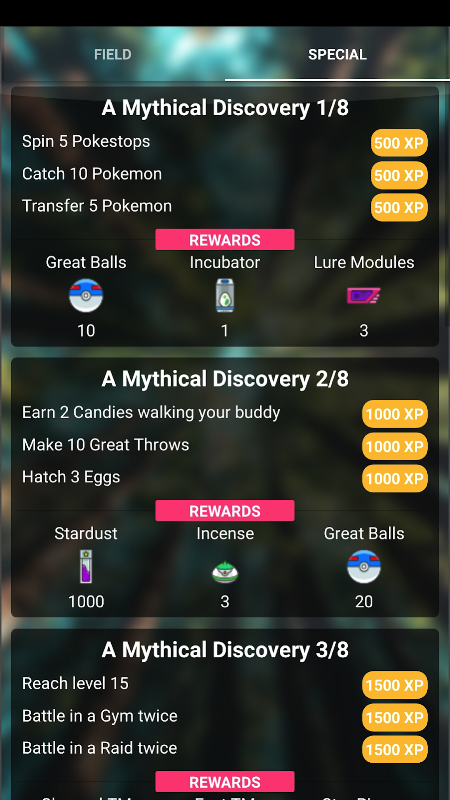 Field Research - Monthly updated field research and Special quests for Pokémon GO is an application divided in two parts "Field" and "Special" for field research and special quests for Mythical pokemons.