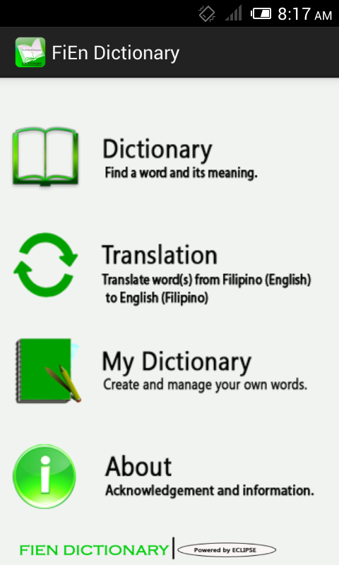 Fien sözlük Filipinli-İngilizce, İngilizce-Filipince Çevirmen Sözlük ile