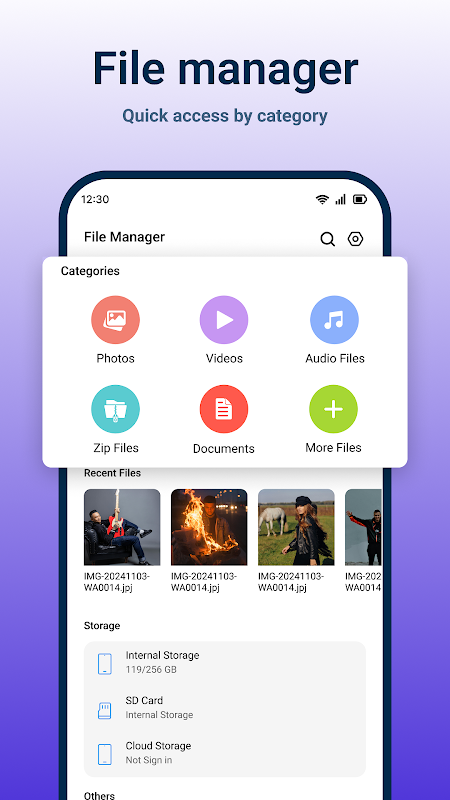 Android için Dosya Yöneticisi, güçlü bir dosya gezgini ile cihazınızdaki veya SD kartınızdaki dosyaları düzenlemenize ve yönetmenize yardımcı olur. Dosya Yönetimi uygulaması, doğal ve profesyonel hissettiren basit bir Kullanıcı arayüzüne sahiptir ve depolama alanınızda gezinmeyi ve yönetmeyi kolaylaştırır. Dosya depolama aracı dosyaları sorunsuz bir şekilde aktarır, yeniden adlandırır veya siler. Fotoğraflarınız, belgeleriniz veya medyanız için güvenilir bir dosya düzenleyicisine ihtiyacınız olsun, bu uygulama depolama alanınızı temiz ve verimli tutmak için tasarlanmıştır. Bugün sezgisel dosya gezginlerimizle dijital hayatınızı basitleştirin.