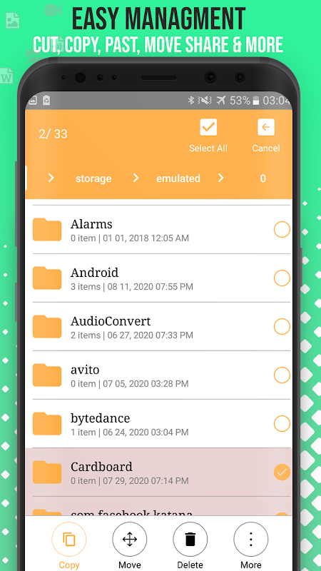 Profesyonel Dosya Yöneticisi: Sezgisel arayüzü ile uygulama, telefonunuzda veya bir microSD kartta depolanan herhangi bir dosya veya klasörü yönetmenize olanak tanır. Uygulama; kesme, kopyalama, yapıştırma, taşıma, silme, yeniden adlandırma, ayrıntılı test etme, dosya paylaşımı ve daha fazlasını içeren eksiksiz bir araç yelpazesi sunar. Hafıza kartı ve SD kart. Yeniden adlandırılmış bir dosya olarak mükemmel çalışır ve herhangi bir dosya biçimini açabilecek gibi görünür.