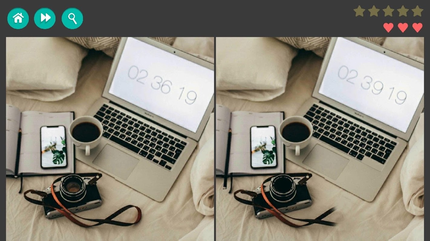 • ZAMAN SINIRI YOK. Rahatlayın. Acele etmiyoruz seni. İki resim arasındaki farkın ne olduğunu bulmak için ihtiyaç duyduğunuz kadar zaman ayırın. Görüntüleri ayırt etmek için çok hızlı olmayın ve çok yakında düğmesine dokunun.