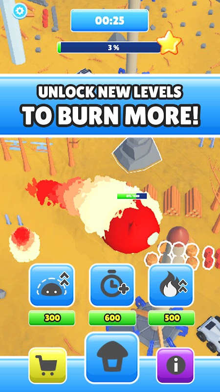 FireBlob'da, zaman dolmadan önce% 100 boyuta ulaşma hedefiyle nesneleri tüketerek büyüyen küçük bir ateş yaratığını kontrol ediyorsunuz. Seviyeleri tamamlamak, zaman, boyut ve ateş gücü gibi yükseltmeler için harcanabilecek paraları ödüllendirir. Bir anahtar mekaniği, döngüye girdiğinde nesneleri yok etmek ve bonus paralar kazanmak için patlamalar yaratan bir alev izi bırakmanıza izin vererek oyuna stratejik bir katman ekler.