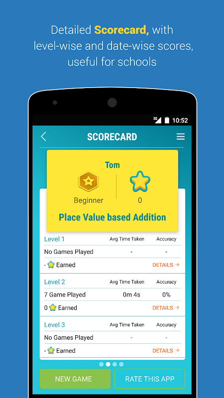 You can monitor the progress of your child (or if you are a teacher, you can monitor the progress of your class), using the accuracy and average time taken metric given in the scorecard. The badge system (silver, gold, platinum) provides a quick preview of your child’s progress.