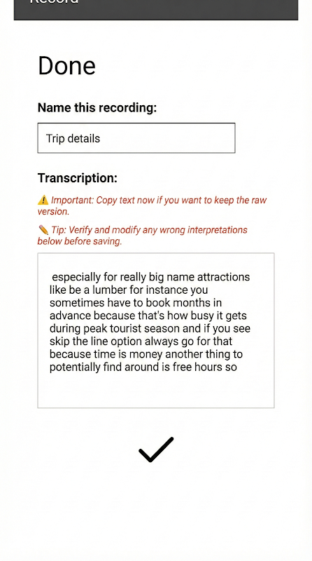 Özel ve Güvenli: "Yapılacaklar" öğeleriniz yerel olarak saklanır. Ses notları ve transkripsiyonlar saklanmaz ve yalnızca kendi telefonunuz tarafından yerel olarak işlenir. Hassas fikirler ve özel düşünceler için mükemmeldir.