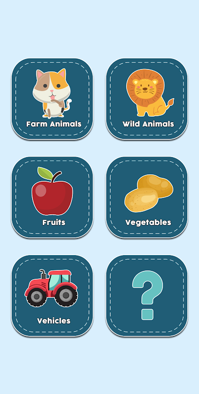 Bu uygulama 5 kategoride çok güzel resimler içeriyor: Çiftlik Hayvanları, Vahşi Hayvanlar, Meyveler, Sebzeler ve Araçlar. Her Çiftlik Hayvanı ve Vahşi Hayvanlar da sırasıyla hayvan sesleri içerir. Uygulama ayrıca, çocuğunuzun hafızasını test etmenize yardımcı olmak için her kategorinin sonunda ücretsiz yerleşik "Resmi Tanımla" oyunu içerir.