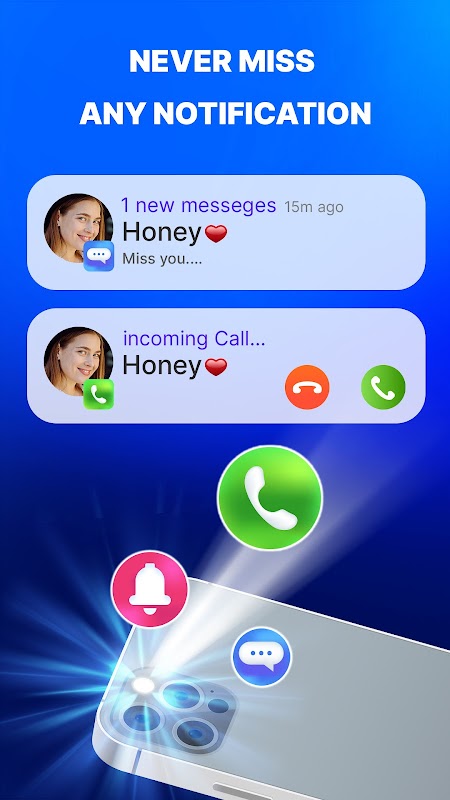 Önemli bir bildirimi bir daha asla kaçırmayın. Aramalar, SMS ve uygulama bildirimleri için telefonunuzu aydınlatan anında flaş uyarıları alın. Gelen arama ve mesaj geldiğinde el feneri özelliği sessiz veya gürültülü ortamlar için idealdir.