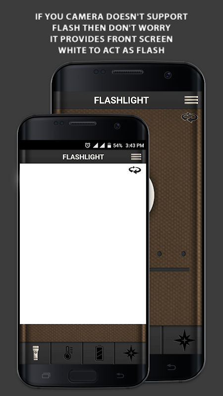 Flashlight is one of the brightest LED torch app with elegant design in Google Play.This application is the brightest and the most useful flashlight you will ever have. Flashlight application is very helpful and useful app when you are in dark. Flashlight app that goes with a compass, giving you the direction in the darkness, that means two in work can be carried out using this app.