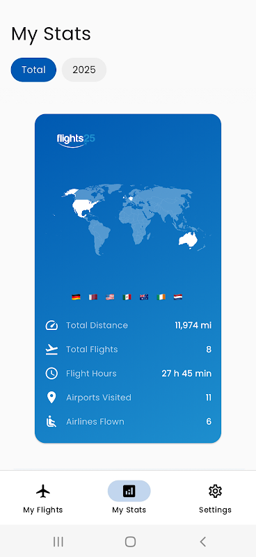 - Kişisel Uçuş Notunuzu Oluşturun: Seyahat maceralarınızı, uçuş yolu görselleştirmeleriyle büyüleyici bir 3D küre üzerinde yeniden yaşayın. Ziyaret ettiğiniz ülkeler, havayolları ve havaalanları hakkındaki istatistikleri gösteren Flights25 biletinizi paylaşın ve yolculuklarınıza dair kalıcı anılar yaratın.
