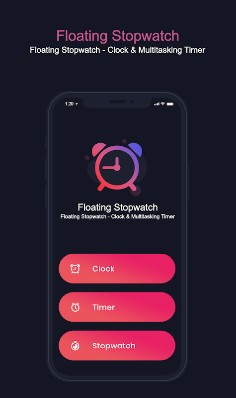 The main purpose of this app is you can use clock, timer, and stopwatch while using other apps on your mobile phone.
