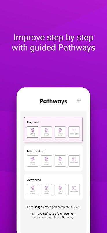 İngilizce konuşma gelişimi yolculuğunuzda bir sonraki adıma ulaşmanıza yardımcı olmak için tasarlanmış yapılandırılmış öğrenme yolları. Başlangıç Seviyesinden İlerleme -> Orta Seviye -> İleri Seviye. Başarılarınızı göstermek için rozetler ve sertifikalar kazanın.