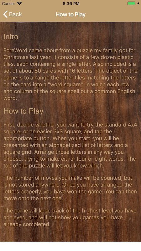 Foreword offers you 3x3 and 4x4 word puzzles in more than 9000 combinations. Play 2-3 times per day to challenge your wits and exercise your brain, for potentially years of gameplay.