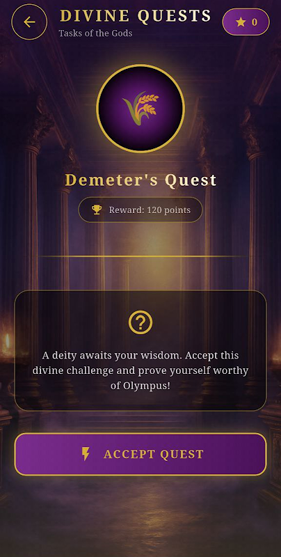 Divine Quests, tanrılar, kahramanlar ve efsaneler hakkındaki bilginizi test eden bir bilgi yarışması oyunuyla mitolojiyi hayata geçiriyor. Tanrıların kendilerinden gelen soruları yanıtlayın, puan kazanın, bonus ödüller için seriler oluşturun ve giderek zorlaşan seviyelerde ilerleyin. Divine Quests, eğlenceyi, stratejiyi ve öğrenmeyi tek bir ilgi çekici deneyimde birleştiriyor.