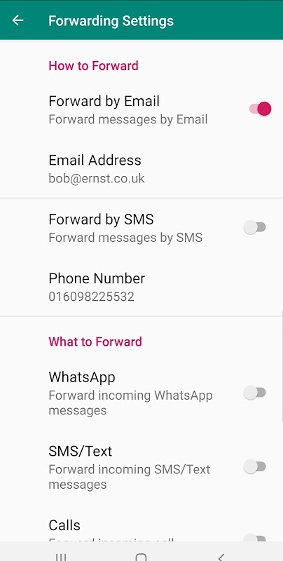 Forward2Me, gelen aramaların, metinlerin (SMS), WhatsApp mesajlarının vb. ayrıntılarını metin (SMS) mesajlaşma yoluyla e-posta adresinize ve/veya başka bir telefona gönderir.