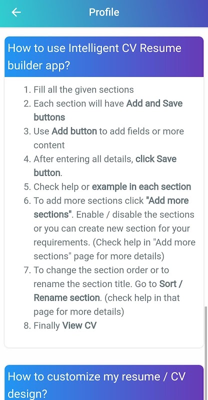 - Create, view, duplicate, manage and delete multiple profiles in this Resume Builder Tool.