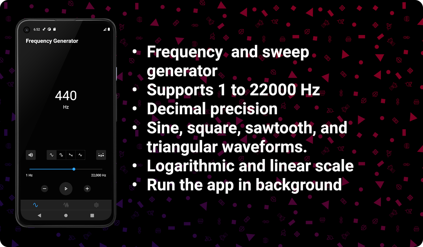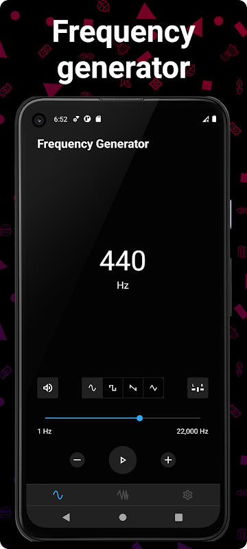 Frekans üreteci, 1Hz ile 22000Hz arasında frekansta dalga formu oluşturmanıza izin veren, sinüs, kare testere dişi ve üçgen ses dalgalarını destekleyen basit bir Android uygulamasıdır.