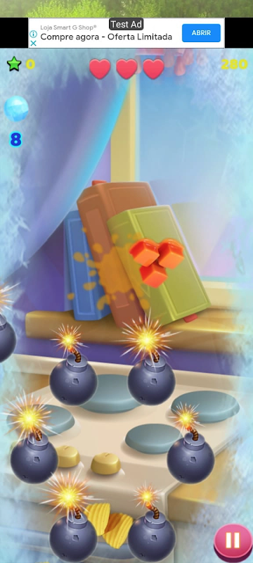 Avaliação: Corte tudo sem deixar nada cair, se cair mais de 3 alimentos você perde o jogo, tome cuidado com as bombas.