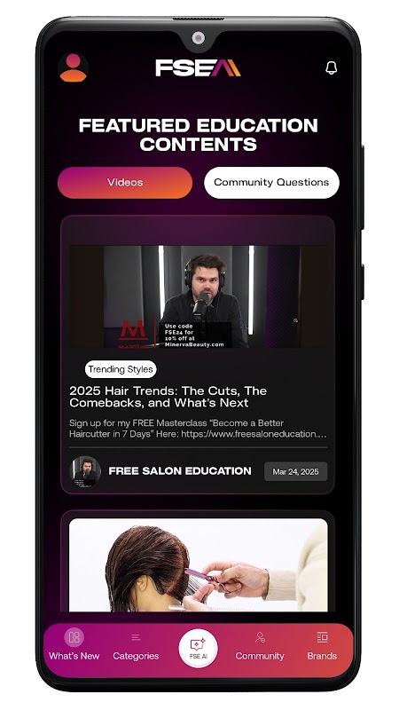 FSE AI, salon profesyonelleri için en iyi eğitim aracıdır. Free Salon Education ve sektörün en iyi markalarından binlerce saç eğitimi, dersi ve podcast bölümünden sorular sorun ve yanıtlar alın. Saç kesme tekniklerini öğrenin, yaygın salon sorunlarını çözün ve iş becerilerinizi geliştirin; hepsi AI tarafından desteklenen kullanımı kolay bir uygulamada. Büyümek, öğrenmek ve ilham almak isteyen stilistleri desteklemek için Matt Beck tarafından yaratıldı.