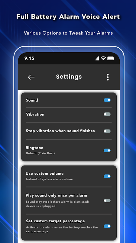 Tam Pil Alarmı uygulaması, enerji tasarrufu yapmanıza ve telefonunuzun pilini korumanıza yardımcı olacaktır. Dolu pil alarm tonunu kolayca değiştirin, herhangi bir sesi alarm olarak ayarlayabilirsiniz.