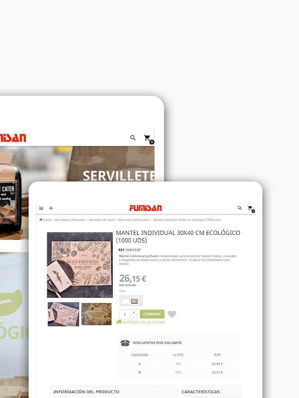 İşletmeniz için ambalaj ve temizlik ürünlerini seçmek hiç bu kadar kolay olmamıştı. Fumisan uygulaması ile işletmeniz için ihtiyacınız olan her şeyi mobil cihazınızın rahatlığından seçebilirsiniz. Konaklama sektöründe uzmanız ve kataloğumuzda her türlü ekolojik ambalaj, tek kullanımlık mutfak gereçleri ve temizlik ürünlerini bulabilirsiniz:
