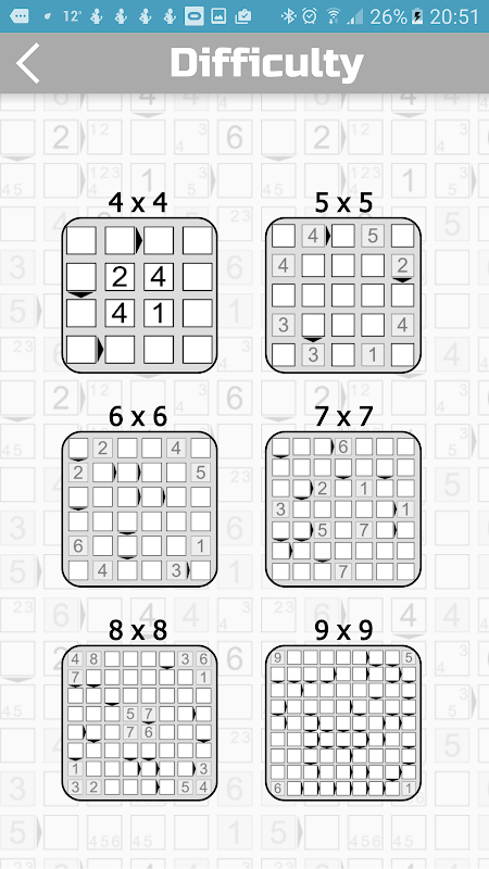 Programda 6 farklı zorluk seviyesi seçebilirsiniz (4x4, 5x5, 6x6, 7x7, 8x8 ve 9x9). Kare ne kadar büyükse, içinden geçmek o kadar zor olur. Futoshiki'yi ilk kez oynuyorsanız, 4x4 kare ile başlamanızı öneririz. Her karmaşıklık seviyesinde 2000 benzersiz oyun seviyesi sunulacak. Sayı ne kadar yüksekse o kadar zor olur. (Seviye 2000 en karmaşık olanıdır).