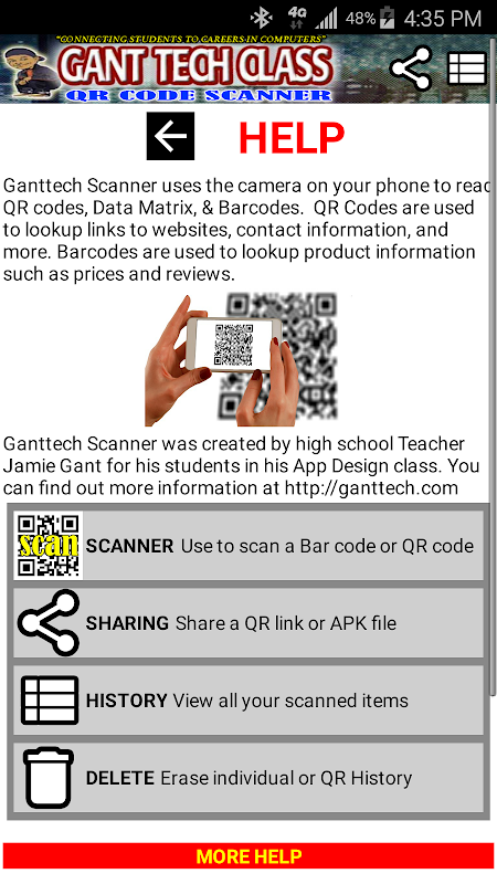 Ganttech Scanner scans, installs, and shares barcodes, QR Codes,& MIT App Inventor apps or APK files on your Android mobile device. Ganttech Scanner was created for Ganttech.com students to share their apps they created in class using MIT App inventor. With Ganttech Scanner, you can MIT App Inventor QR Codes to install, save, and share the Apps (apk) files on your device. Additionally, you can scan barcodes, and general QR codes that link to websites, documents, and more.