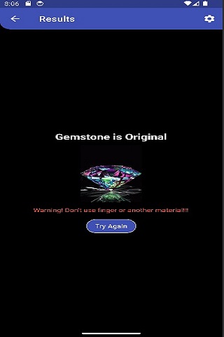 Bu uygulamanın kullanımı çok basittir: sadece uygulamayı açın ve başlat düğmesine tıklayın ve Değerli Taşınızı Ekranda kaydırın. Size Gem'in gerçek mi yoksa sahte mi olduğu mesajını gösterecektir.