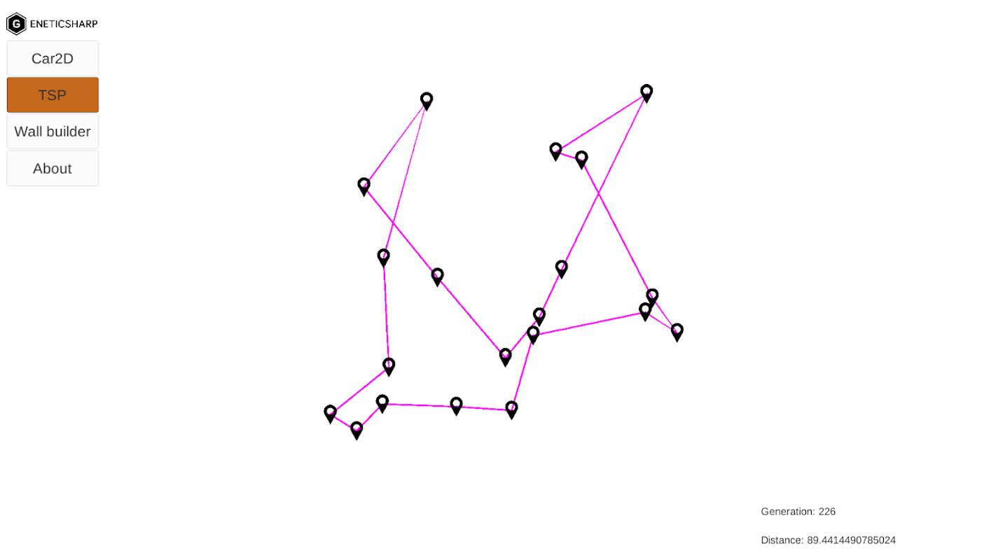 Unity3d'de çalışan GeneticSharp'ı gösteren örnekler: Car2d, TSP ve Duvar oluşturucu