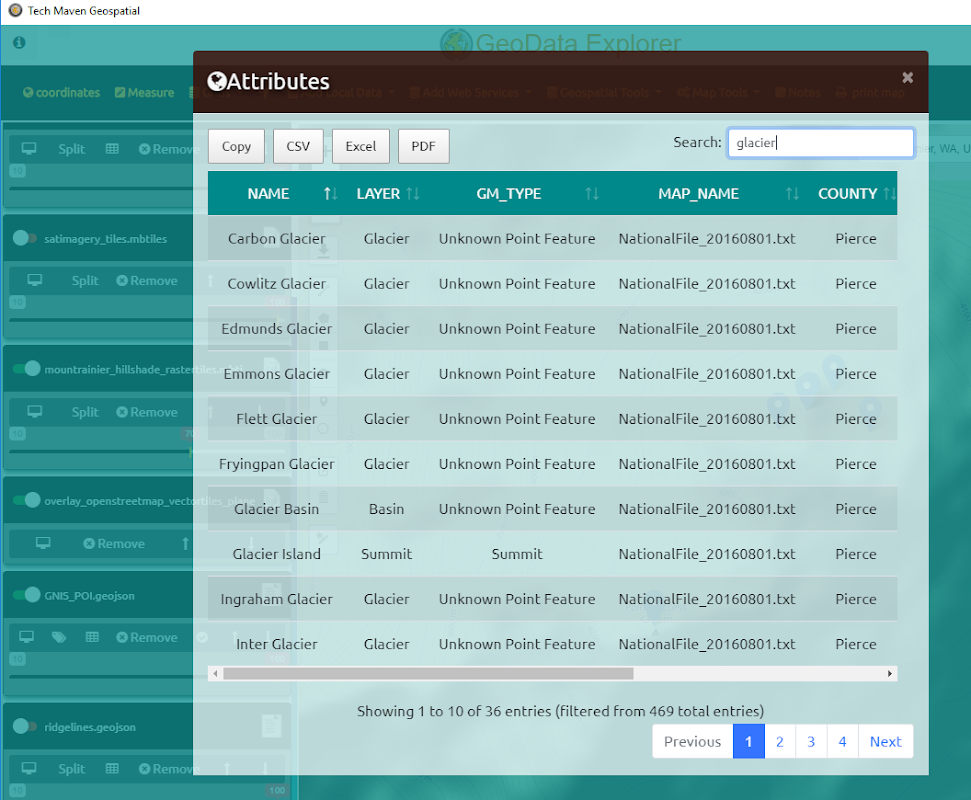 Wide list of Supported formats all displayed in a table of contents with access to attribute table, search, zoom to extent, opacity/transparency slider