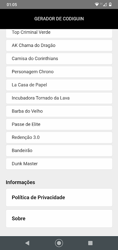 Gerador de codiguin ff Disponíveis até o momento: -Calça Angelical Vermelha -Calça Angelical Azul -Kit Angelical -Top Criminal Verde -Diamantes -AK Chama do Dragão -Camisa do Corinthians -Personagem Chrono -La Casa de Papel -Incubadora Tornado da Lava -Barba do Velho -Passe de Elite -Redenção 3.0 -Bandeirão -Dunk Master
