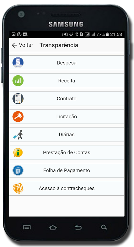 • Legislação: neste item, todas as Leis, Portarias, Decretos e demais legislações municipais estarão disponíveis numa listagem para que o cidadão possa visualizar e, se necessário, fazer o download da legislação no seu smartphone.