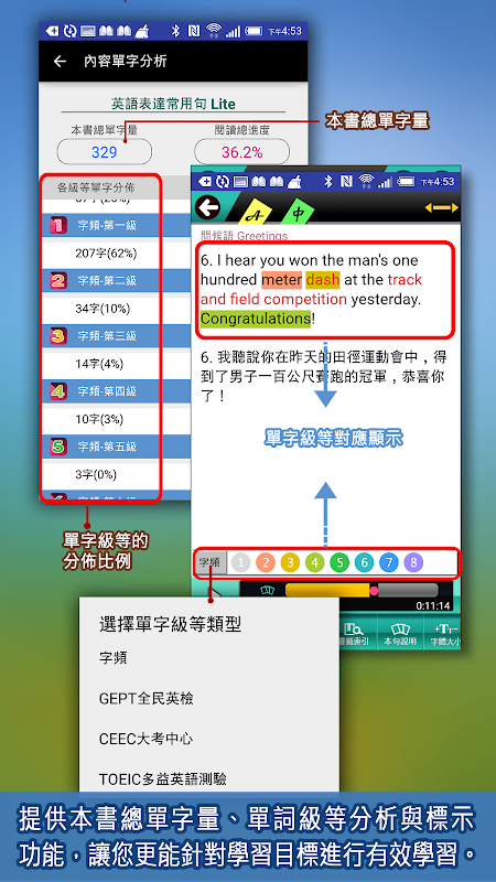 ● 單詞級等標示,您可依學習目標,選擇標示出文章中單詞的級等,級等系統包含有:字頻(8級等)、大考中心(6級等)、全民英檢(3級等)、多益常考用字。一鍵操作,讓您一目了然,可強化單字力學習。