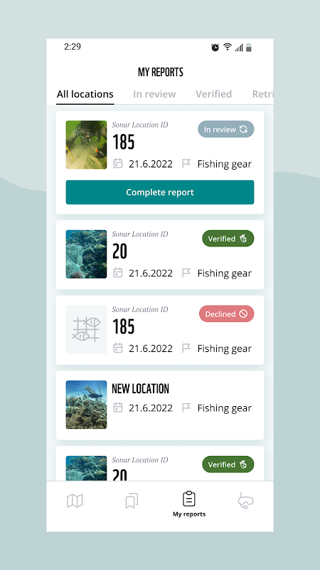 Uygulama size hayalet ağların potansiyel konumlarını bir harita üzerinde gösterir. Desteğinizle, bulgunun gerçekten bir hayalet ağ olup olmadığını öğreneceğiz! Konuma dalın ve konumu doğrulayın. Bu önemli bilgi sayesinde kaybolan av malzemelerinin kurtarılması en iyi şekilde hazırlanabilir ve ağlar özel eğitimli dalgıçlar tarafından kurtarılabilir.