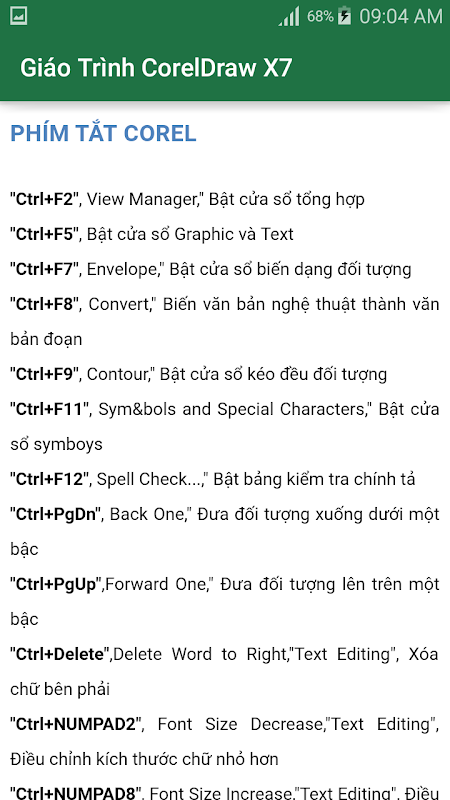 Ngoài ra ứng dụng giáo trình tự học còn có 28 video hướng dẫn chi tiết về Coreldraw x7, và những phím tắt thông dụng sẽ rất hữu ích cho các bạn!