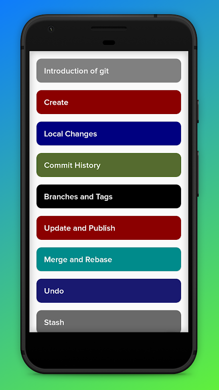 Uygulamada git komutları bir demet. Kullanıcı kısa bir açıklama ile çok fazla komut öğrenebilir. Yeni başlayanlar ve ara ürünler için en iyisi.