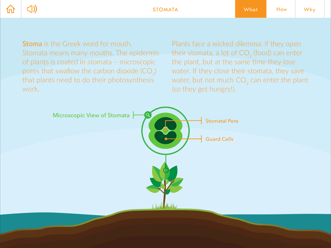 The “Global Change app” is an interactive teaching tool for engaging students with the interrelationships between the global carbon and water cycles. It demonstrates the vital role of the stomata in leaves of plants and the impact of human activities on climate
