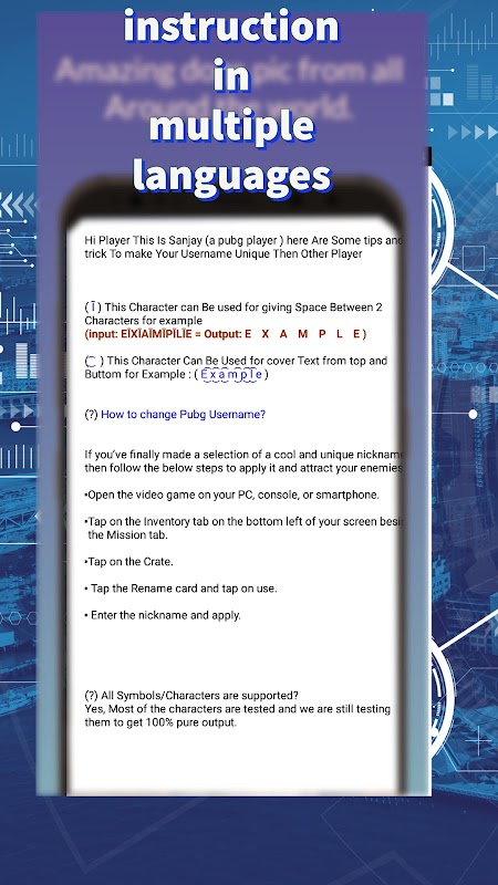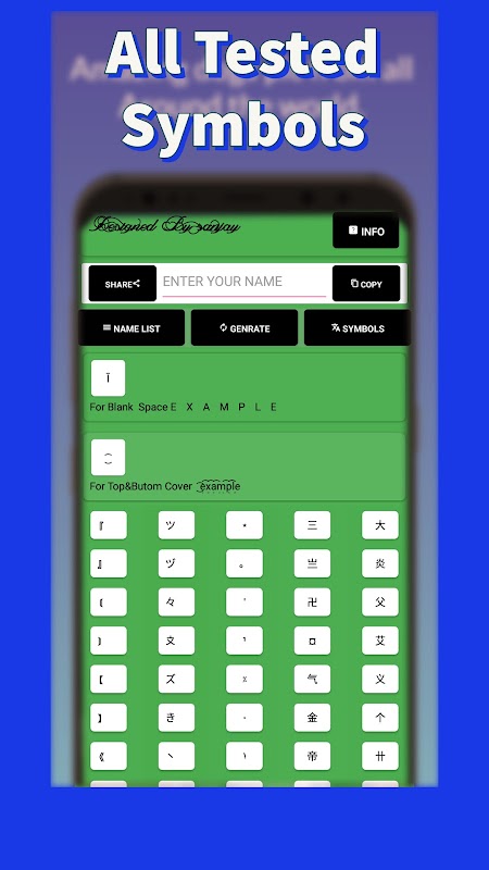 Bu Nickname editörü uygulamasıyla havalı hale getirmek için harika sembollere sahip çok sayıda nadir kaynak var. Seçtiğiniz herhangi bir metni farklı kaligrafik font stilleri ile yerleştirebilir ve farklı font özellikleri ile oyun Squad profilleriniz için de güzelleştirebilirsiniz.