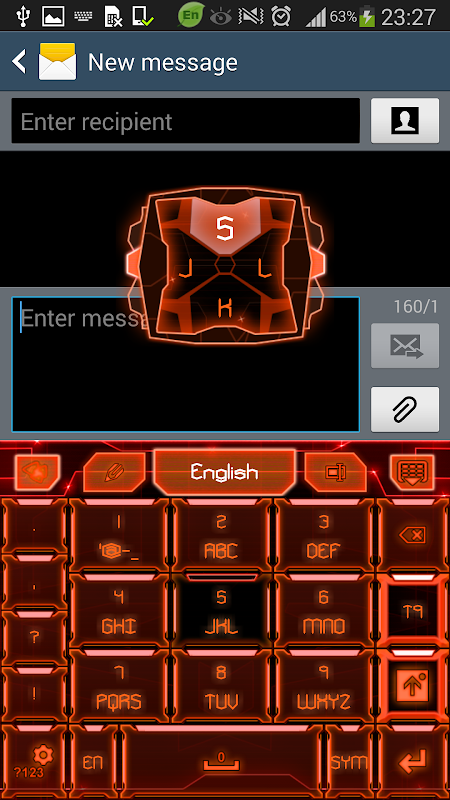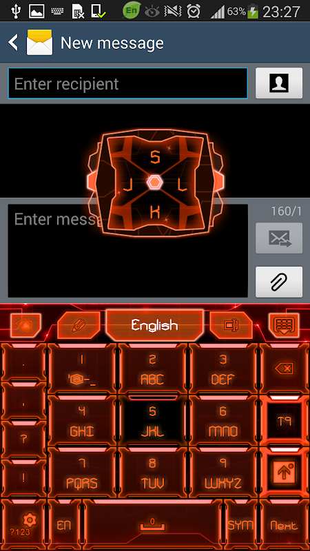 "GO Keyboard Orange Tech Theme" is a premium HD theme, designed by Inner Works Studios, for the sci-fi technology heads. The transparent keys have an amazing orange neon tech effect, they glow like a laser on a dark background, everything shines orange on a dark futuristic alien space ship design. The incredible high tech graphics will transform your keyboard with a unique stylish high-tech look. Enjoy our new free theme and feel free to check out the rest of our Tech series keyboards!