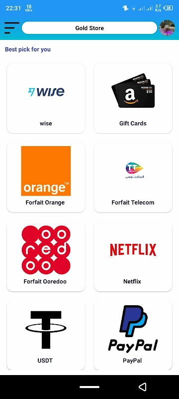 Gold Store, Tunus'taki kullanıcılara çok çeşitli dijital ürün ve hizmetleri satın almaları için sorunsuz ve kullanışlı bir platform sağlamak üzere tasarlanmış yenilikçi bir mobil uygulamadır. İster bir Spotify aboneliği, Netflix erişimi, kripto para birimleri veya diğer dijital ürünler satın almak istiyor olun, uygulamamız tek durak çözümünüzdür.