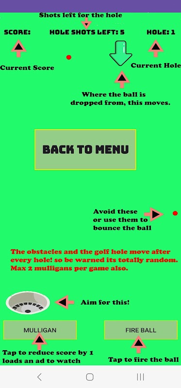 Rastgele delik konumları ve engellerle basit ve bağımlılık yaratan bir golf pinball/plinko oyunu.