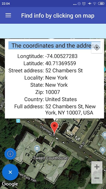 1. Koordinatları kullanarak adresi bulun. Boylam ve enlemi tamamlayın ve bir işaretleyici ile haritadaki noktayı görün. İşaretçiye tıklayın ve tam adresi görün.