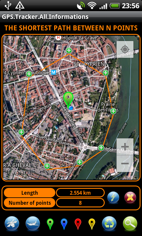 Bu GPS araçları tedavileri bilgi sağlar: mesafeleri, alanları, uzunlukları, perimeters, açılar, yolları, dikkat çekici noktalar, kesişme noktaları, öngörülen noktaları, yükseklik, çapraz, medyan, bisectors, incircle, circumcircle, ...