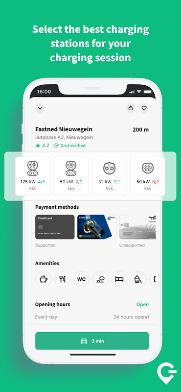 Uygulama, doğru şarj istasyonunu seçmeniz için ihtiyacınız olan tüm bilgileri içerir: konektör türü, şarj kapasitesi, açılış saatleri ve GRID topluluğunun incelemeleri.